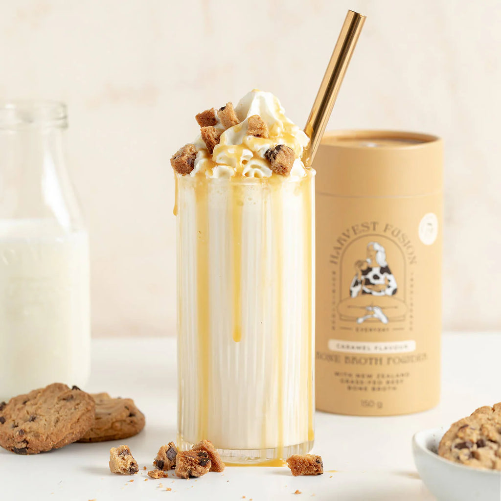 This Caramel Bone Broth Powder is the perfect blend of function and flavour. A warm, toffee kiss brew made from NZ grass-fed bone broth. It delivers collagen, protein and key amino acids in each serve, with a salted caramel flavour that feels like a treat.